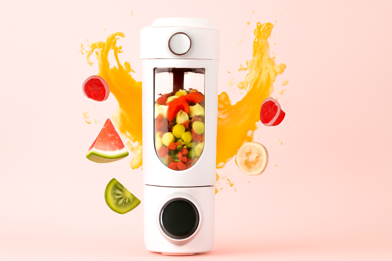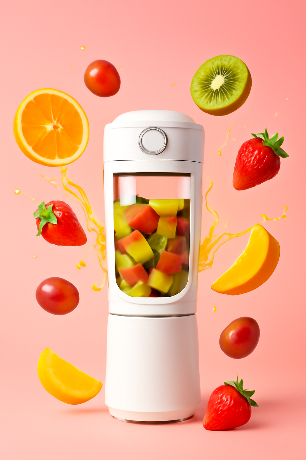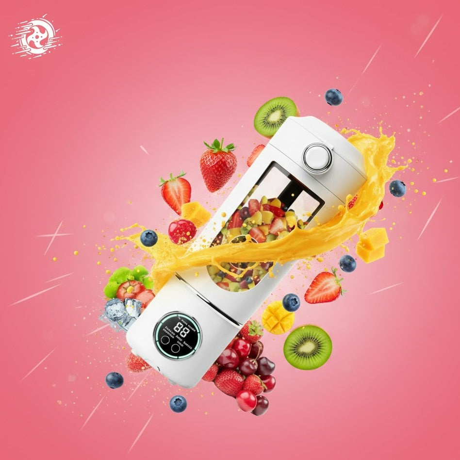 This visual captures the vibrant energy of fresh fruits bursting into motion, highlighting the power and speed of a compact portable blender. It shows how easily you can turn strawberries, kiwis, mangoes, and blueberries into a smooth, refreshing drink within seconds. The sleek design and digital display emphasize modern convenience for everyday use. Whether you're at home, at work, or on the go, this blender brings effortless nutrition right into your lifestyle.
